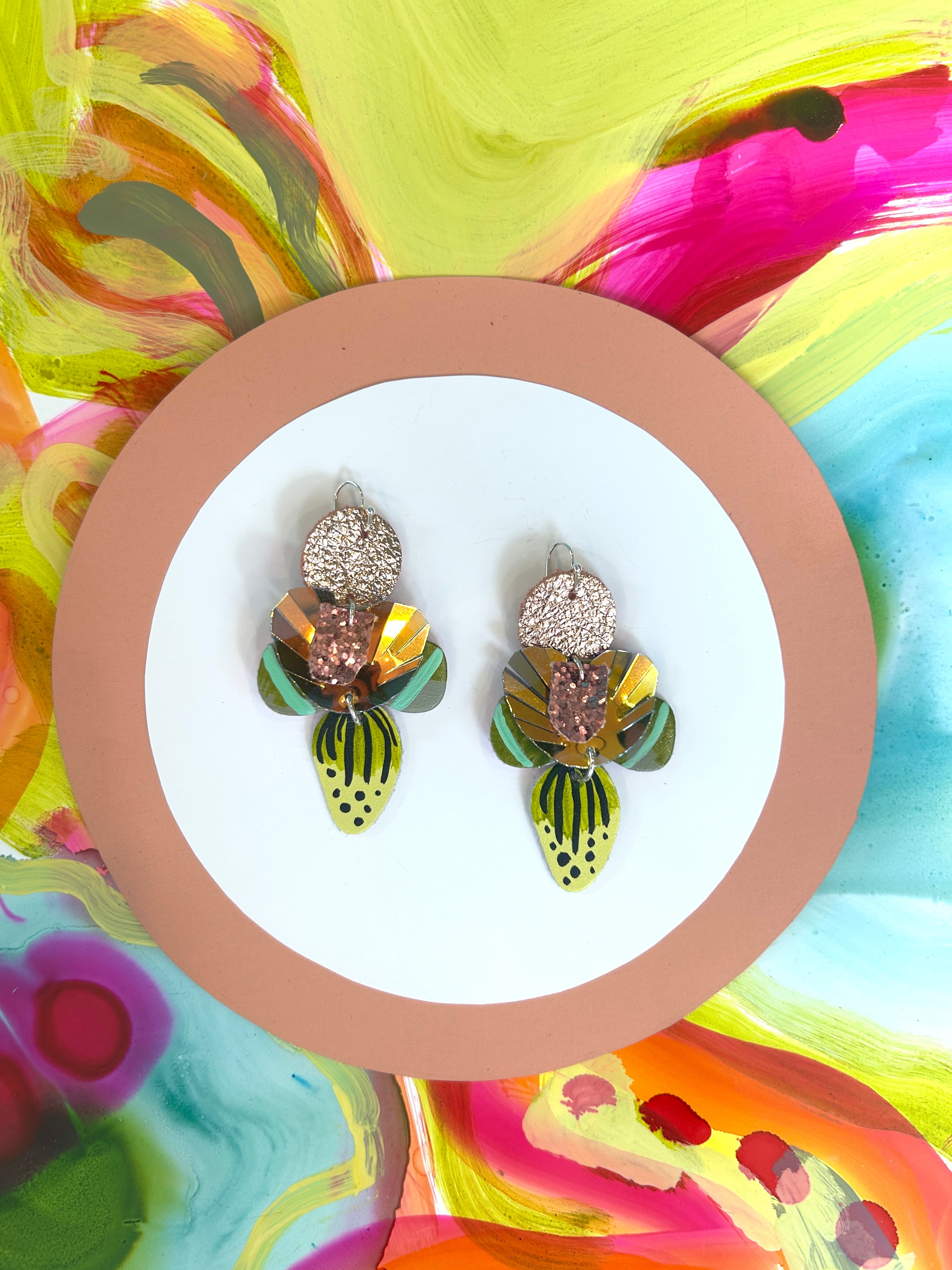 Handpainted dusky green leather shapes with pops of lemon yellow. Shimmery golden hour fringed pieces and rose gold glitter. Hand-painted leather shapes have a marshmallow pink painted back, metallic rose gold leather shapes have a soft suede back.
