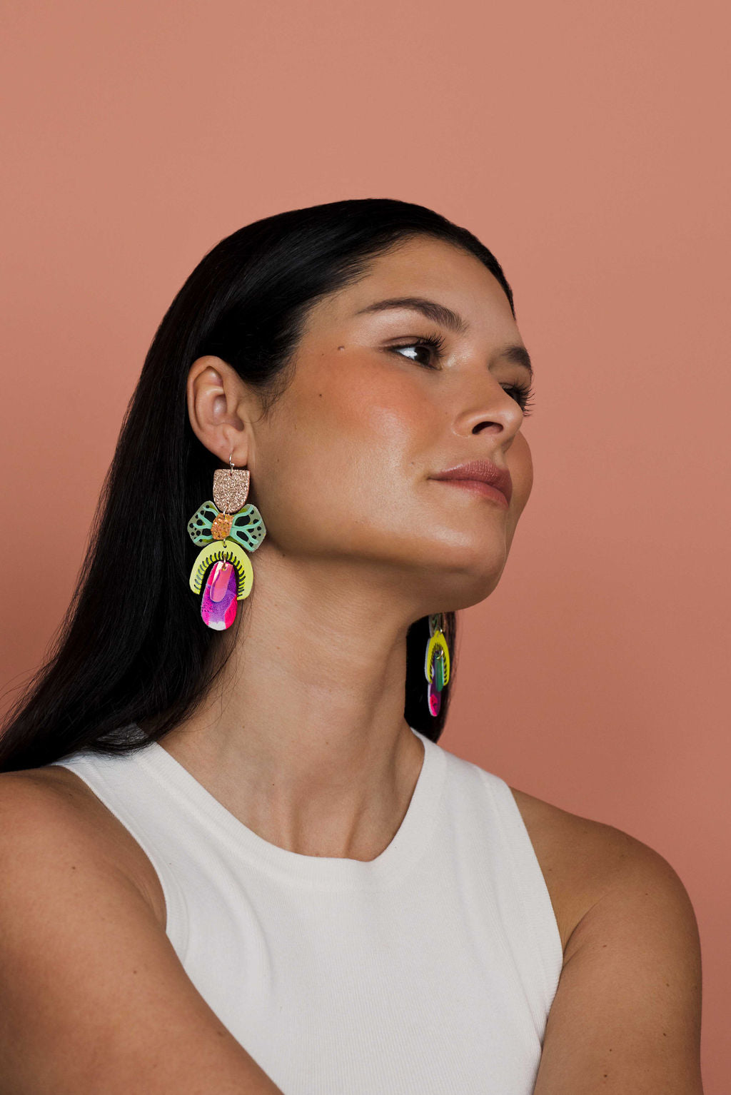Meet Tongariro – your gorgeous, go-to, ride-or-die earring. Daring yet understated (at least by Mazdevallia standards!). Named after the Tongariro Alpine Crossing considered one the of the most visually stunning 1-day hikes in the world, this abstract earring design riffs off the sight of a dusky sunset reflected on mineral-rich thermal lakes resting atop Mt Ruhepehu. Unlike the Tongariro Alpine Crossing (which whilst captivatingly beautiful is a bloody hard slog!) Tongariro statement earrings will take you effortlessly from the office to date night to early-morning basketball practice with class. With a dreamy colour palette of rose gold, sugary tangerine glitter, coral pink and lemon, these versatile earrings are super chic and oh-so-pretty. They’re also considered the ‘gateway earring’ to bigger, brighter styles. Tongariro is the perfect way to kickstart your Mazdevallia addiction. But be warned: it’s a slippery slope from here to shoulder-grazers (i.e. watch out for Lady Knox!)